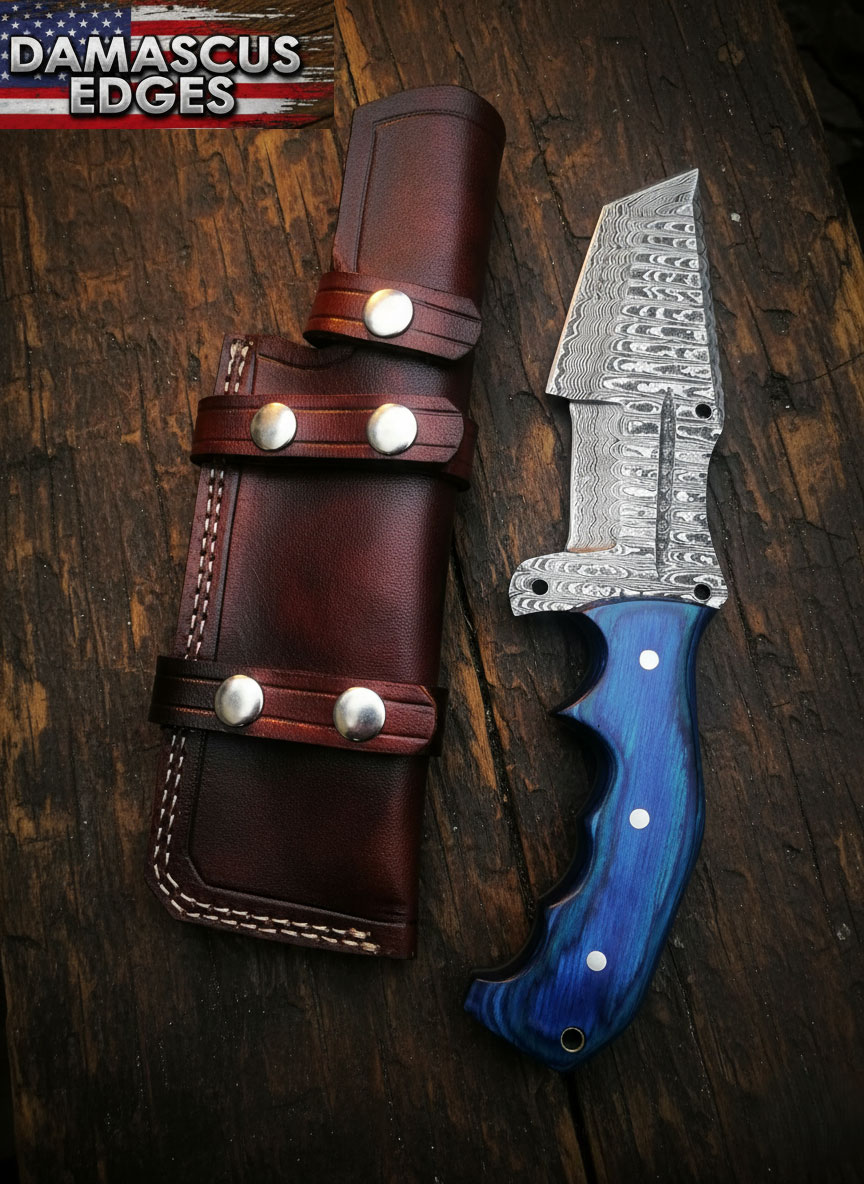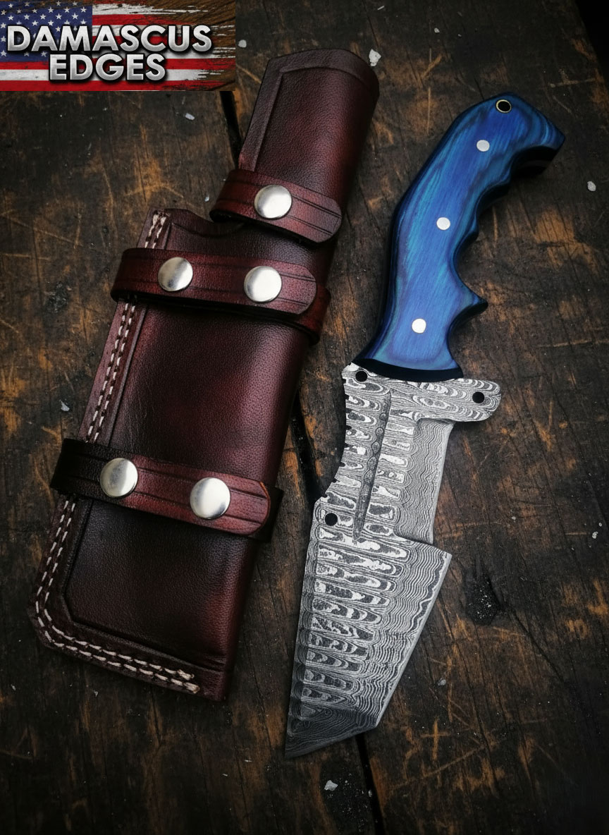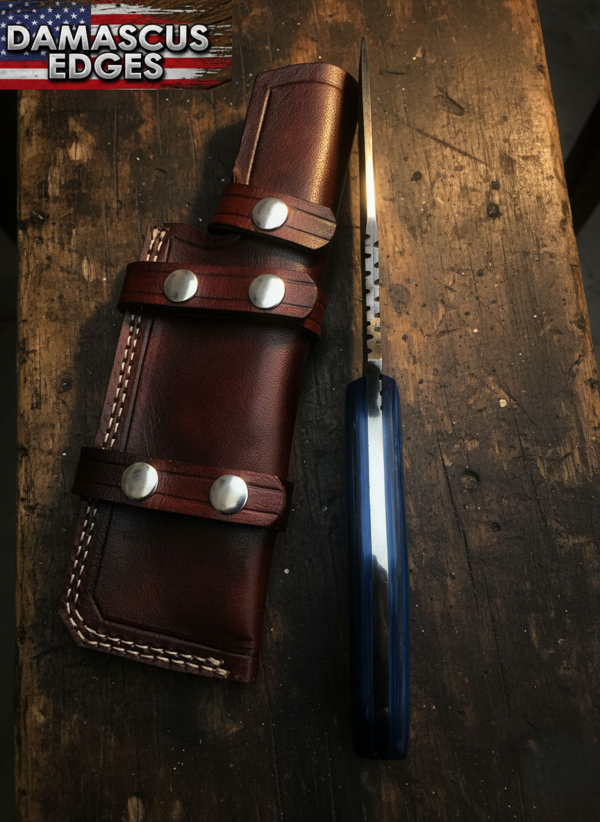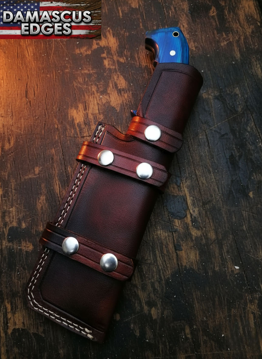 With a 6-inch blade and 5-inch handle, it’s perfectly balanced for hunting, camping, or field survival. The blue Pakkawood handle provides a secure and comfortable grip, while the hand-stitched brown leather sheath adds an authentic rustic touch. Every detail reflects the dedication and passion of traditional bladesmithing — built for those who respect the craft and love the outdoors.