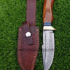 Blade Length: 5.1″ | Handle Length: 4.6″ Materials: Damascus Steel Blade, Rosewood Handle, Brass Guard, Pakka Wood and Brass Spacers Comes with a Handmade Leather Sheath for Convenient Belt Carry